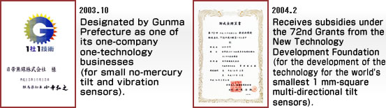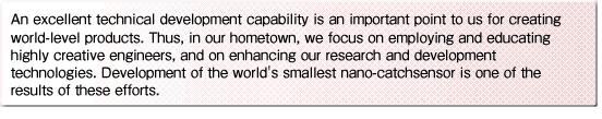 Globalization, represented by economies becoming borderless and the widespread use of the Internet, is causing keen international competition, but has also ushered in an age when local businesses with technical capabilities can develop products for the world market. This is an era that favors us in attaining further growth together with our local community. Thus, with cooperation from Gunma Prefecture and New Technology Development Foundation, we have expanded our R&D facilities, including clean rooms and vacuum manufacturing units, and have focused our energies on employing and educating creative engineers. In 2004, we succeeded in developing the nano-catchsensor, the smallest in the world, in the field of tilt and vibration sensors. The nano-catchsensor has great potential in such areas as automatic conversion and keyless inputs on liquid crystal screen of digital cameras and cellular phones. We will work to commercialize the sensor, and will also try to develop worldwide products in other fields as well. |