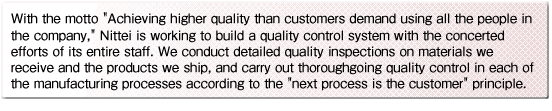 Product quality is the element Nittei regards as most important in the manufacture of its own brand and OEM products, as well as vibration and tilt sensors. We believe it is most important for us to always attain a level of quality that is higher than customers demand. Thus, we have introduced a non-touch image-measuring machine, and our specialized technical staff strictly conducts acceptance inspections of parts and shipment inspections of products, processing the inspection data using personal computers. In each of the manufacturing processes, our production staff also controls quality from a high-level sense of quality, and all of our people work together to maintain a perfect quality control system.